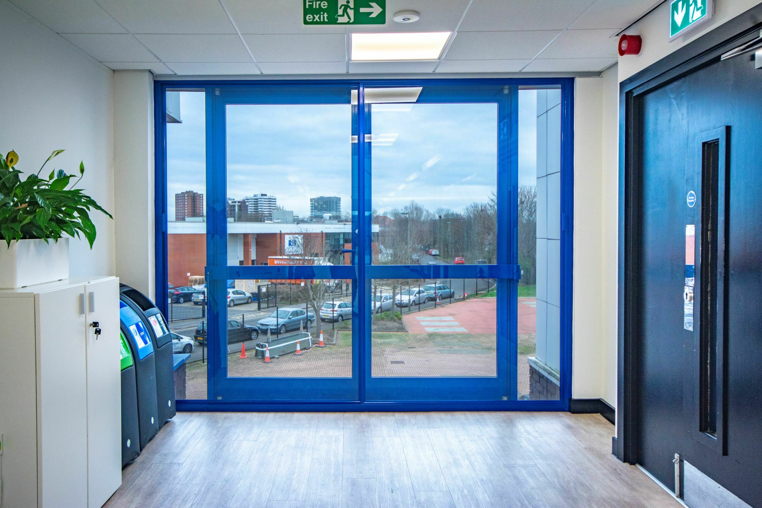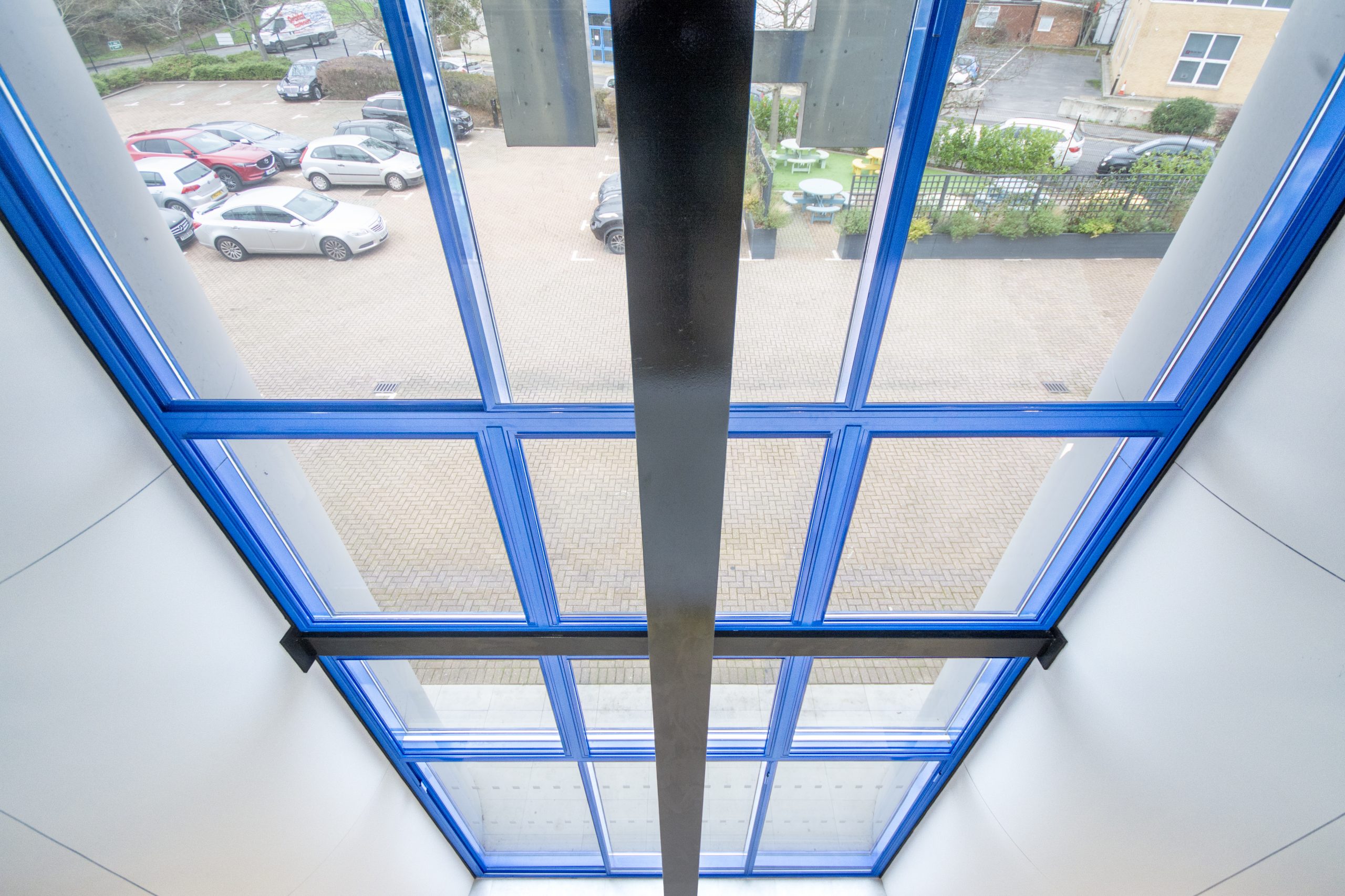 Sunbury House’s reception area showcases large areas of curtain walling several metres high. To treat large areas of glazing, Granada Glazing often couple and stack secondary glazed units with a stacking and coupling support bar. This support bar allows Granada to connect secondary glazed units allowing for total coverage of the existing windows.