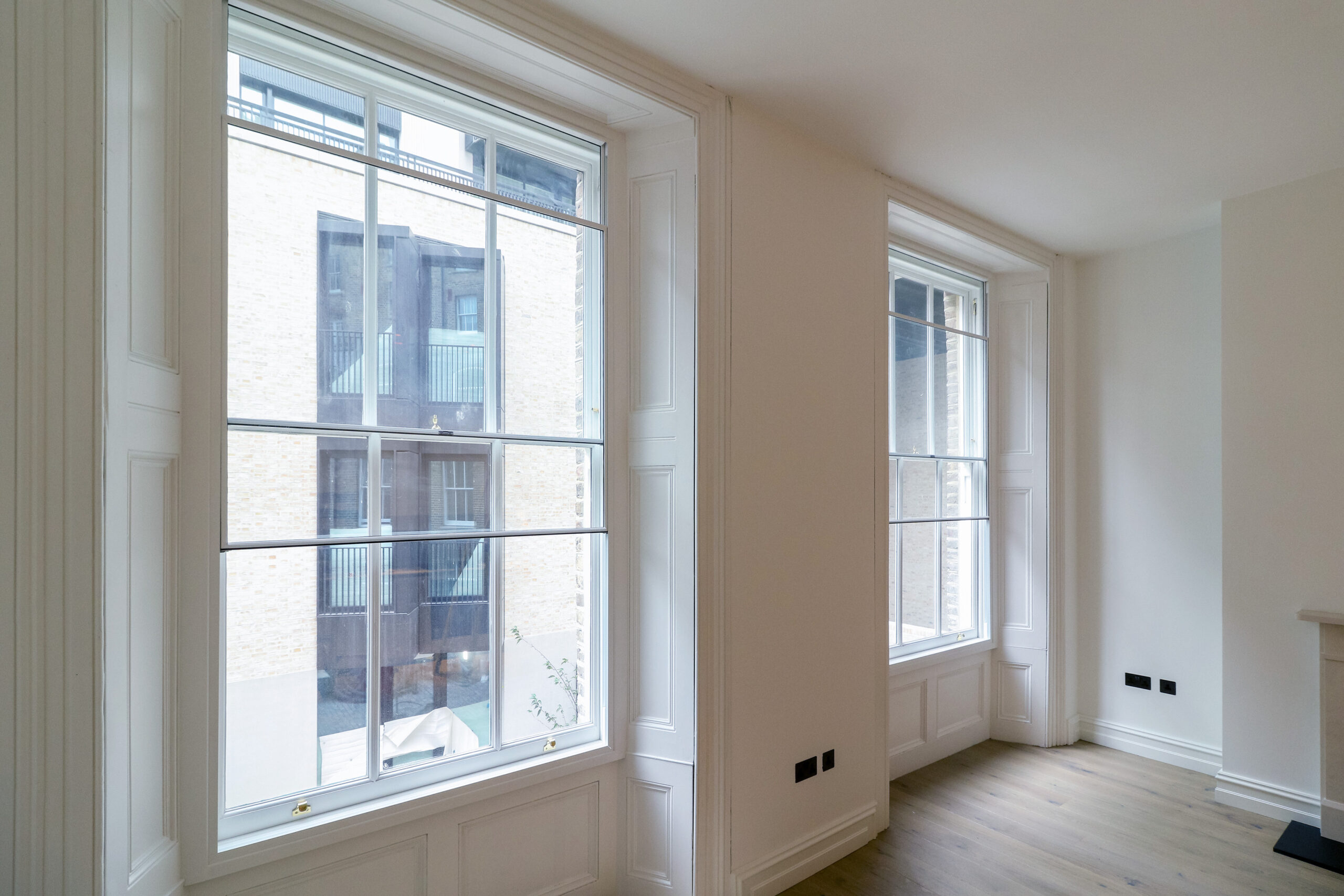 Powder-coated in an RAL 9003 satin finish, the slimline aluminium frames were fitted to the newly refurbished timber primary sash and casement windows. Discreet and not visible from the outside, secondary glazing can make buildings up to 80% quieter by reducing noise levels up to 54dB. Adding an internal panel improves thermal insulation by up to 65%, helping to retain heat and lower energy bills.